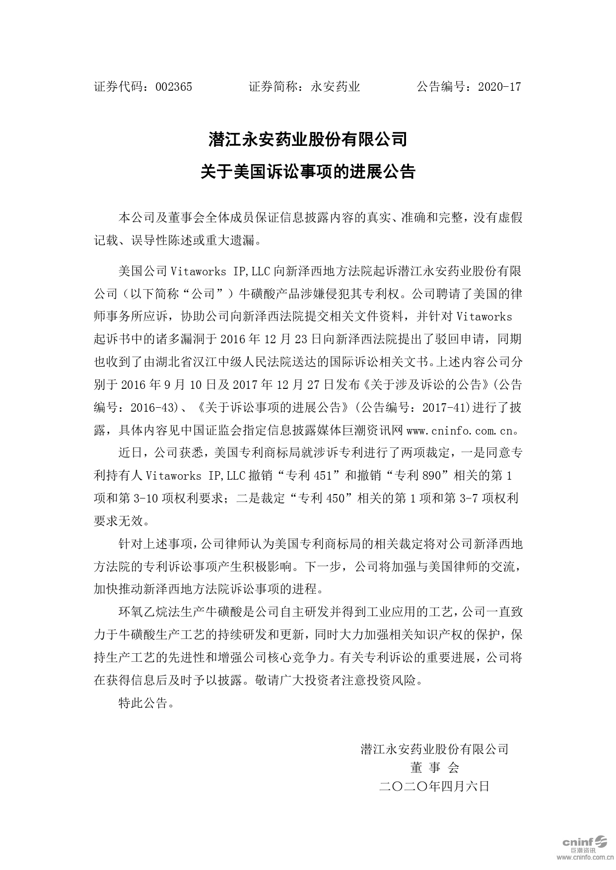 關于美國訴訟事項的進展公告